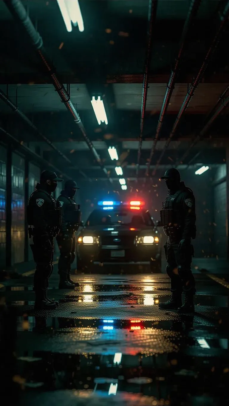 Within a poorly lit parking garage enveloped in shadows and fluorescent flickering, a secretive arms deal unfolds atop oiled concrete. Golden weapons glint beneath the artificial light as rival crews stare each other down behind tinted goggles and vivid tattoos. A lone police cruiser prowls outside, its siren glow bleeding through the grated entrance like a heartbeat. Floating embers and fluttering cash swirl in slow motion, caught in the heavy silence before chaos. Gritty composition favoring subdued tones with dynamic highlights, strong vanishing-point lines drawing focus toward the central exchange.