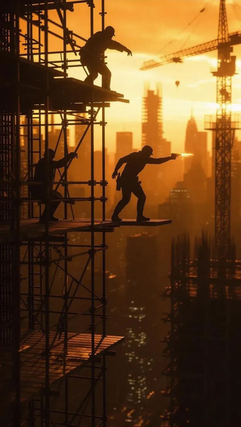 A thief skillfully navigates the scaffolding of a construction project, pursued by hired guards. The city skyline glows ominously in the background, with cranes and incomplete structures emphasizing the frantic situation. The scene is illustrated with bold angles and a gritty, raw atmosphere.