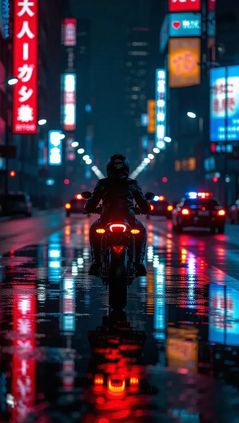 A lone motorcyclist in a black leather jacket speeds down a deserted highway, backlit by the glow of streetlights and city advertisements. Digital reflections shimmer across puddles, and behind him, a chain of patrol cars twist through city shadows. Motion-capture angle from below, sparks trailing from the tailpipe, dramatic shallow depth of field.