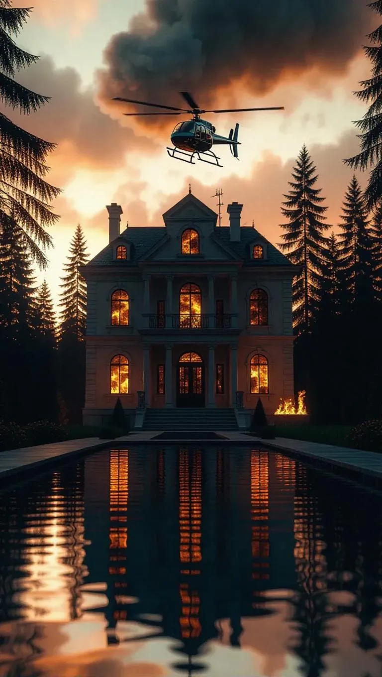 A booby-trapped mansion explodes on the outskirts of a city, fireballs silhouetting birch trees, as a helicopter escapes into the dusk sky. Infinity pool reflects both fire and streetlights. Epic wide shot with deep layering and orange-teal blockbuster palette.