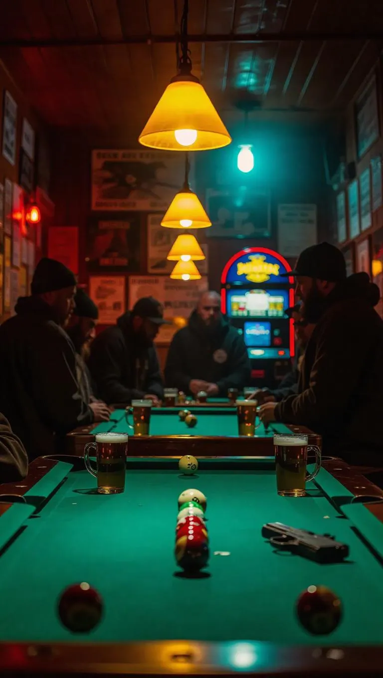 Inside a smoky pool hall, under flickering yellow lamps, gang members crowd around a marble table, weapons resting beside beer mugs. The walls sweat with age, paper flyers peeling back years of criminal history. A jukebox flickers in the corner, stuck between static and a country track. Isolated character lighting with strong foreground blur and rustic texture.