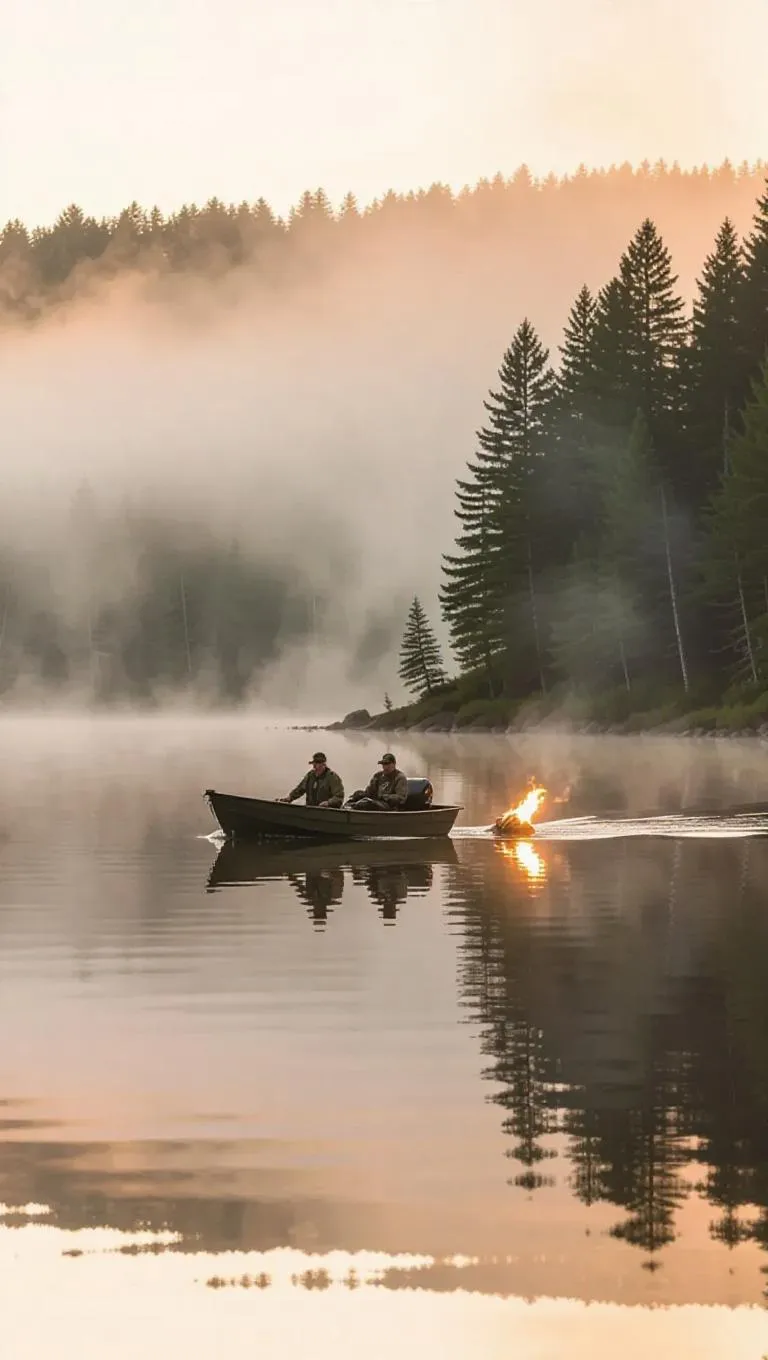 A getaway boat glides silently across a misty lake, its crew evading wildlife watchers. The scene is illuminated by the flickering flame of bonfires and the dense fog surrounding the shore.