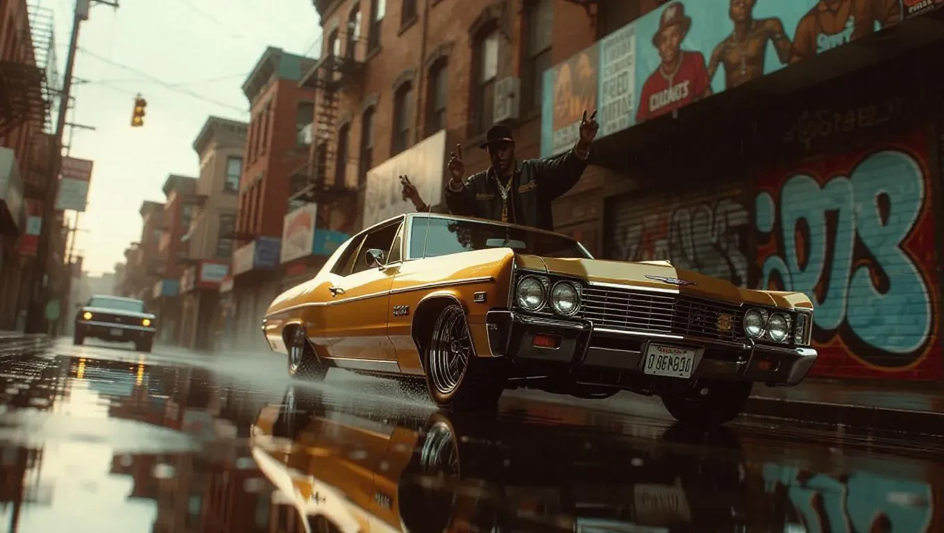 A classic lowrider bounces down a rainy city street in golden hour light, with gangsters hanging from the windows throwing signs. Murals of local heroes line the buildings, while jazz music and gunshots blend in the air. Cool tones with retro color grading and lens flares.