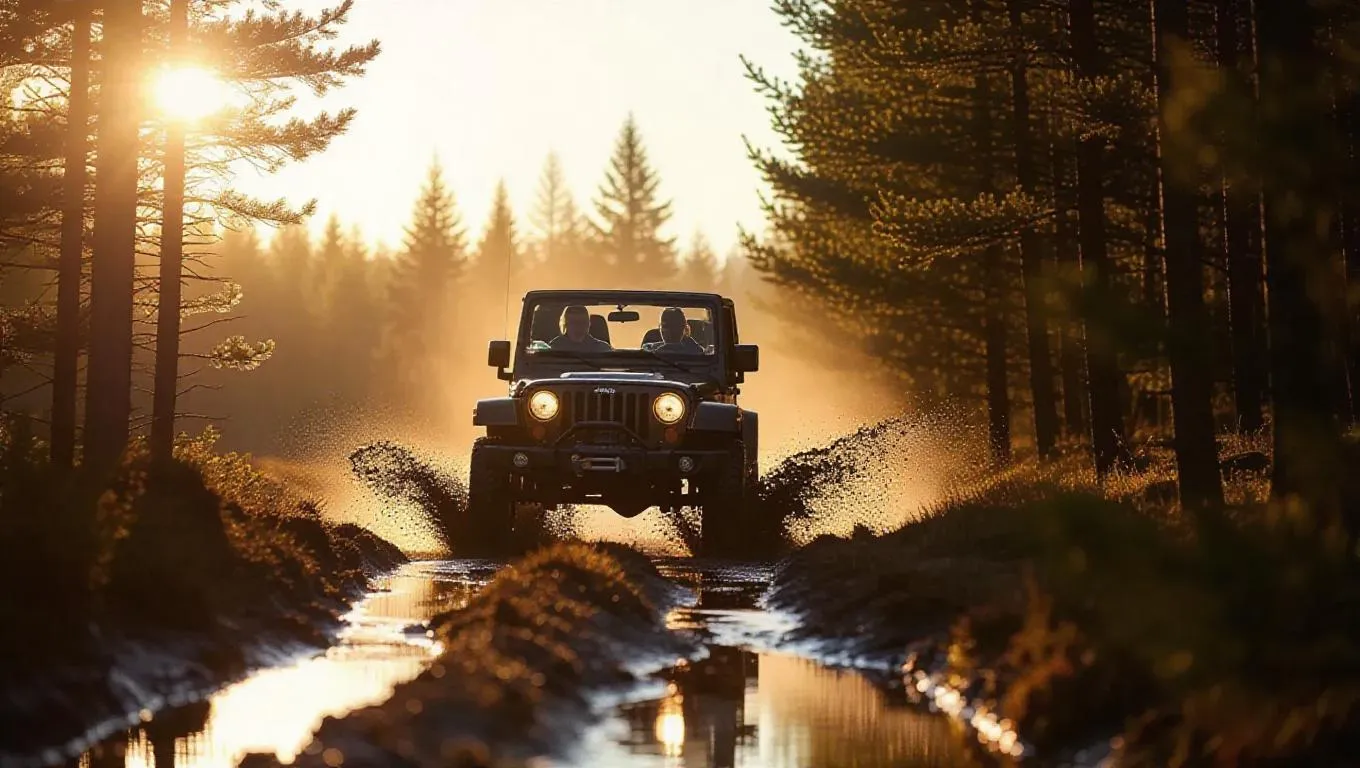 A rugged jeep maneuvers through a muddy trail at sunset, with adventurers inside cheering and enjoying the ride. Adventure murals of explorers fill the trees along the path, while nature sounds and laughter weave in the air. Earthy tones with adventurous color grading and lens flares.
