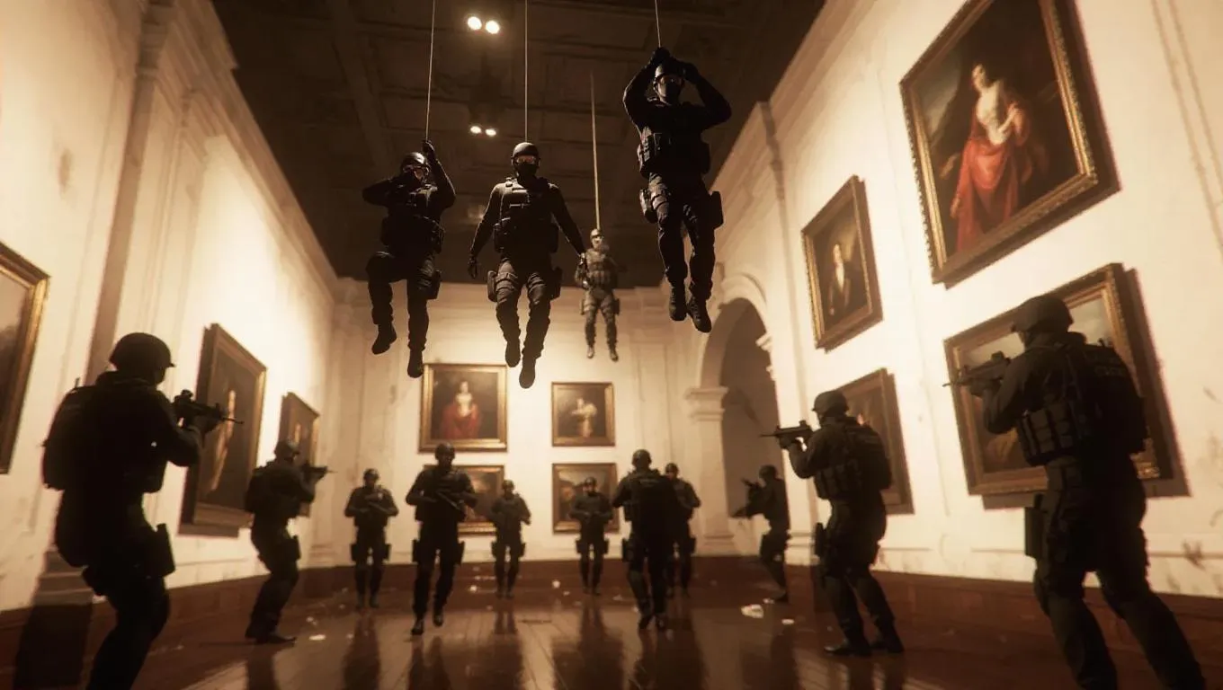Inside a trendy art gallery in Liberty City, a high-stakes heist unfolds. Thieves, clad in sleek black outfits, descend from the ceiling using grappling hooks, stealthily stealing priceless paintings. Alarms blare, casting a chaotic glow, as security guards sprint through the halls, guns drawn, to intercept the criminals.