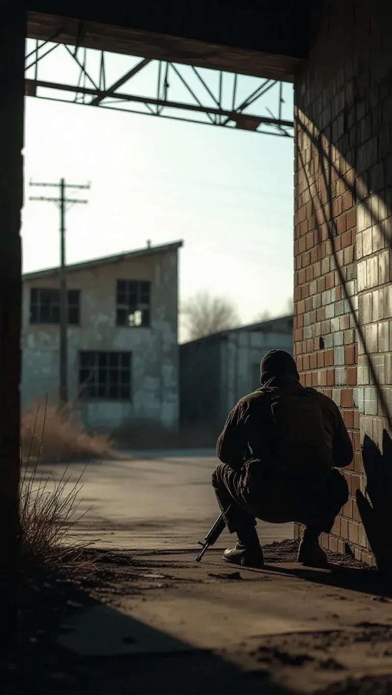 A lone sniper crouches behind a weathered wall in an abandoned industrial area, overlooking a deserted street. Their target, a notorious gangster, approaches a run-down warehouse. The composition highlights the gritty, urban decay and the sniper's silent patience.
