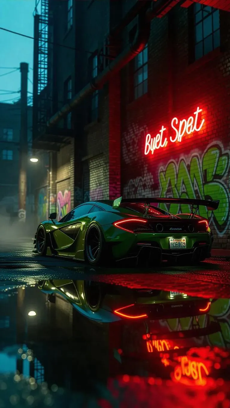 A stolen supercar drifts through an industrial area at dusk, its undercarriage catching flickers of neon from old factory signs. Green and brown reflections wash across the vehicle's sleek design, mirrored by the rough brick walls nearby. In the background, steam rises from old pipes, while street artists spray colorful murals onto vacant walls. The ambiance is raw and gritty, captured in low angles, dramatic shadows, and bold colors imbuing speed with artistic flair.