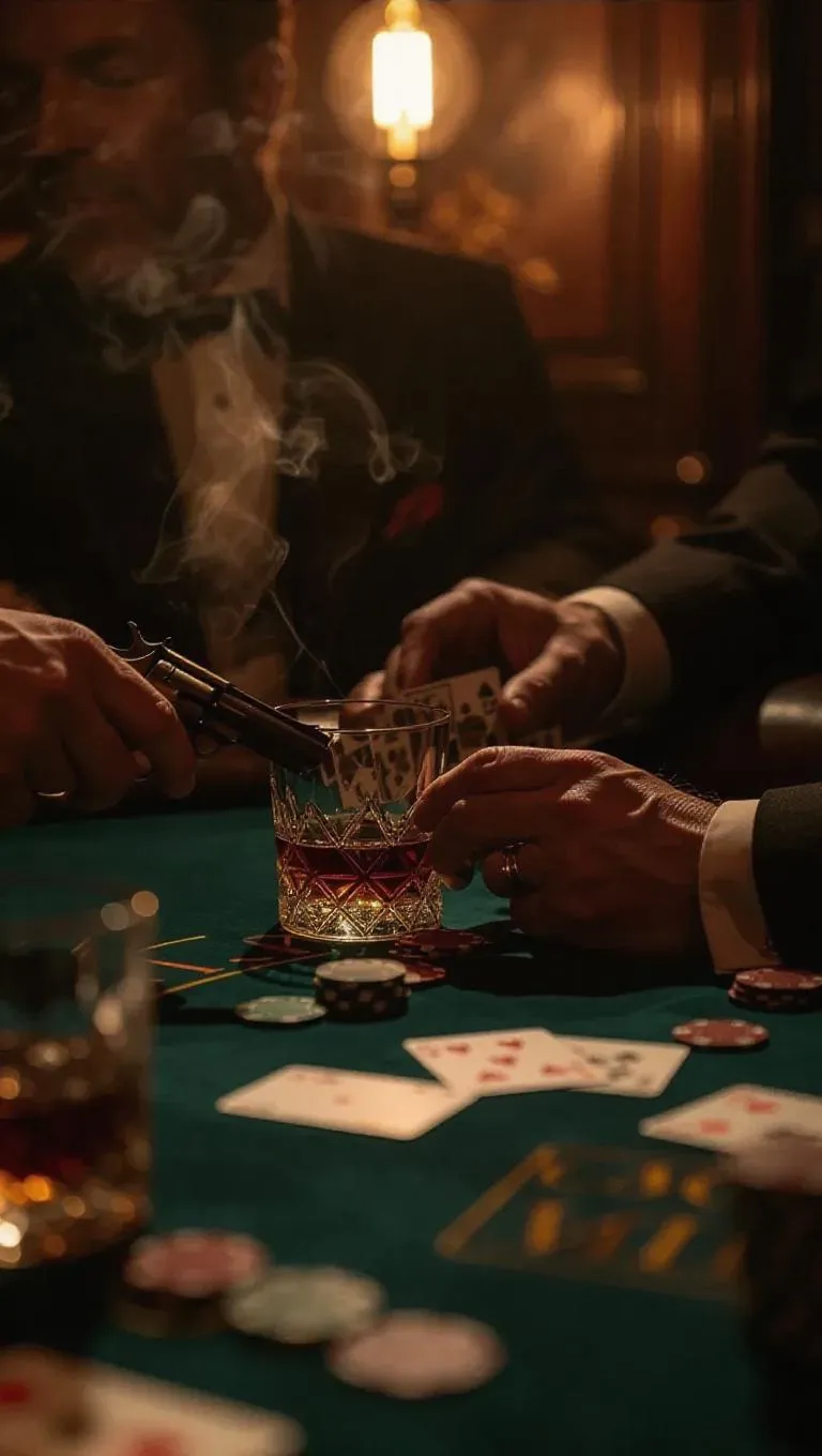 A secret poker game between kingpins in a candlelit speakeasy, where pistols lie beside whisky glasses and stained hands hold royal flushes. Smoke curls around low-hanging bulbs. Gritty, jazz-noir visual texture with focused bokeh.