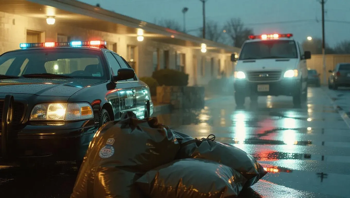 A tense exchange unfolds in a crumbling motel parking lot, duffel bags of cash and drugs spread on the hood of a sleek luxurious car. Headlights abruptly flood the scene as a police van skids to a halt, capturing the chaos with blurred motion and a gritty, high-contrast atmosphere.