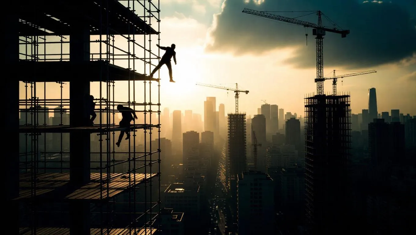 A thief scales the scaffolding of a construction site, pursued by shadowy figures. The city skyline glows in the background, with cranes and unfinished buildings creating a sense of urgency. The scene is captured with dramatic angles and a moody, atmospheric tone.