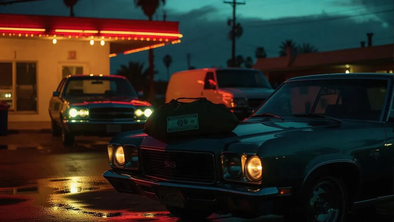A tense exchange unfolds in an abandoned motel parking lot, duffel bags of cash and drugs spread on the hood of a classic car. Headlights abruptly flood the scene as an unmarked delivery van skids to a halt, capturing the chaos with frantic motion and a dimly lit atmosphere.