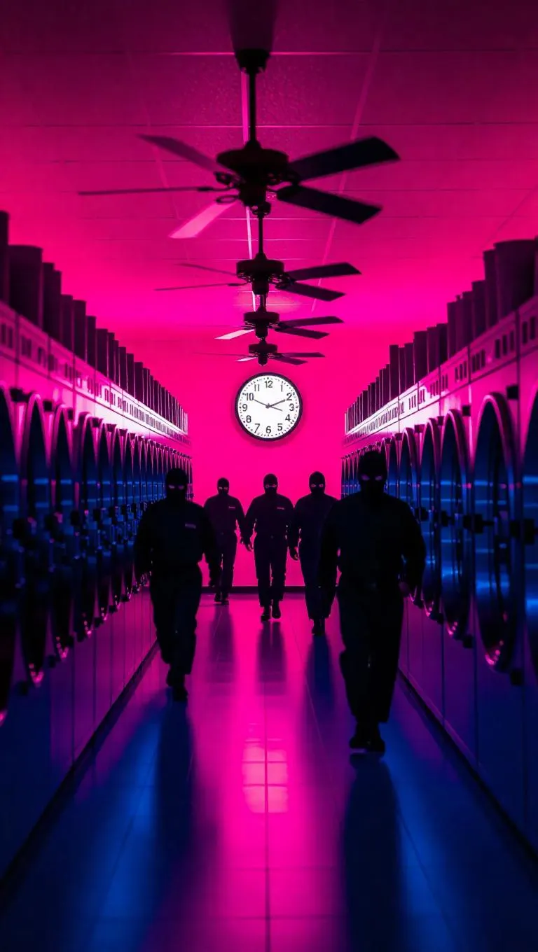 A drug lab hidden beneath a laundromat glows with ultraviolet light, shelves filled with supplies, as figures in black masks sprint to destroy evidence before a raid. Ceiling fans cast eerie rotating shadows across an oversized clock. Tense neon-dystopia interior with retro texture.