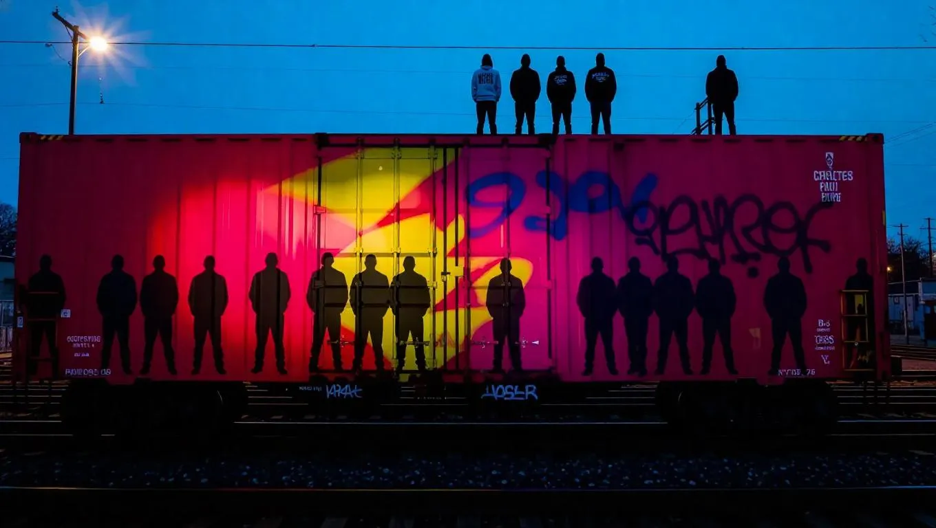 A squad of graffiti artists paints an elaborate mural on a freight train, their silhouettes cast by a flickering streetlight. The far-off wail of police sirens resonates through the district. This setting is staged with a bold, urban aesthetic and a contrasting color palette.