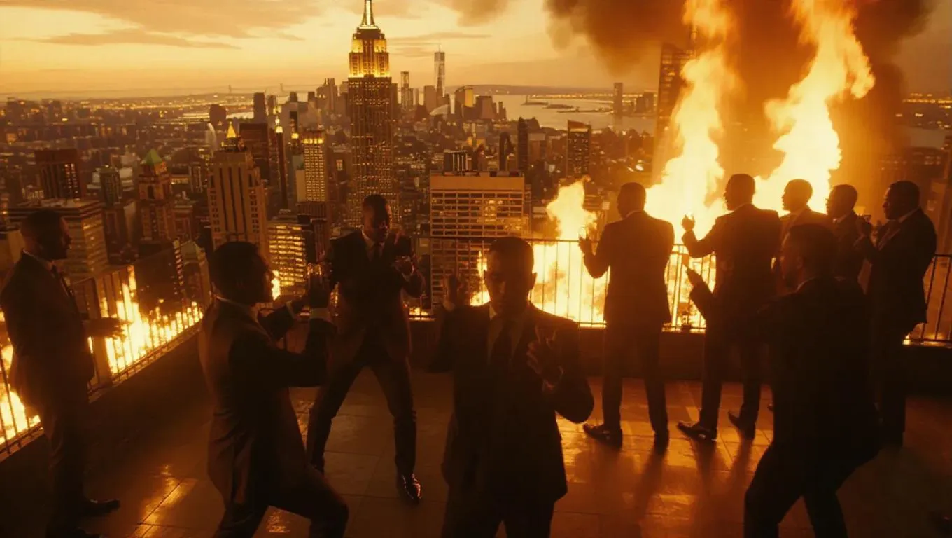 A lavish rooftop party erupts into chaos as rival gangs clash over a high-stakes money laundering scheme. The city skyline is washed in golden hues, with flames roaring above. The scene is captured with a surreal, high-contrast tone, emphasizing the tension and excitement.
