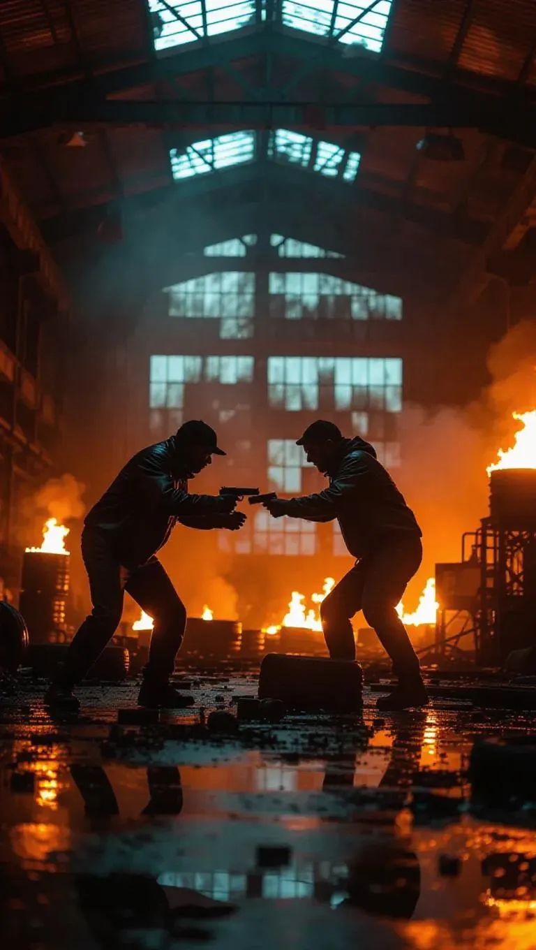 Two rival gangs clash in an abandoned warehouse, using old machinery and tools as weapons, the scene illuminated by the warm, flickering glow of burning tires, creating a chaotic, gritty, and intense atmosphere.