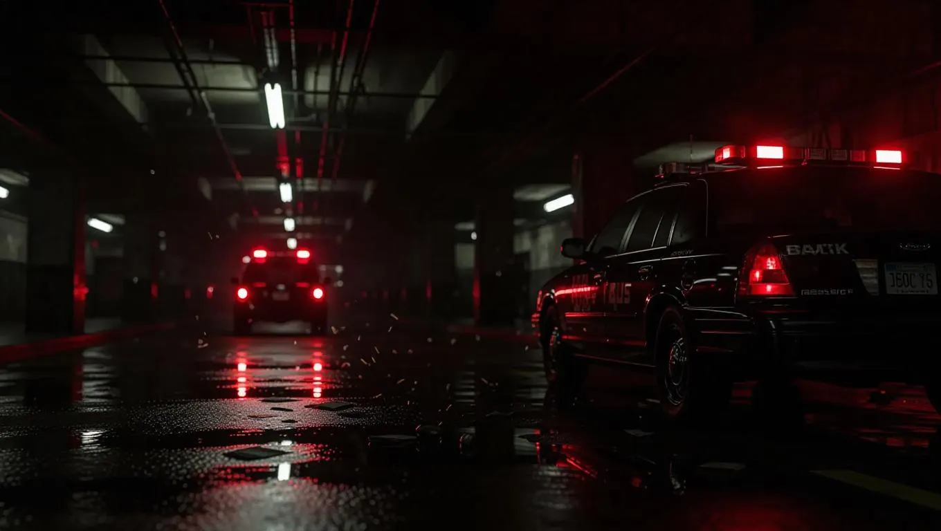 Within a shadow-filled parking garage dominated by exhaust and flickering lights, a covert arms deal unfolds atop scuffed concrete. Black revolvers glint beneath the light as rival crews confront each other behind tinted glass and striking tattoos. A lone police van prowls outside, its siren glow bleeding through the grated entrance like a heartbeat. Floating embers and crumpled cash dance in slow motion, caught in the heavy silence before chaos. Dramatic composition favoring low-key colors with bright highlights, strong vanishing-point lines drawing focus toward the central exchange.