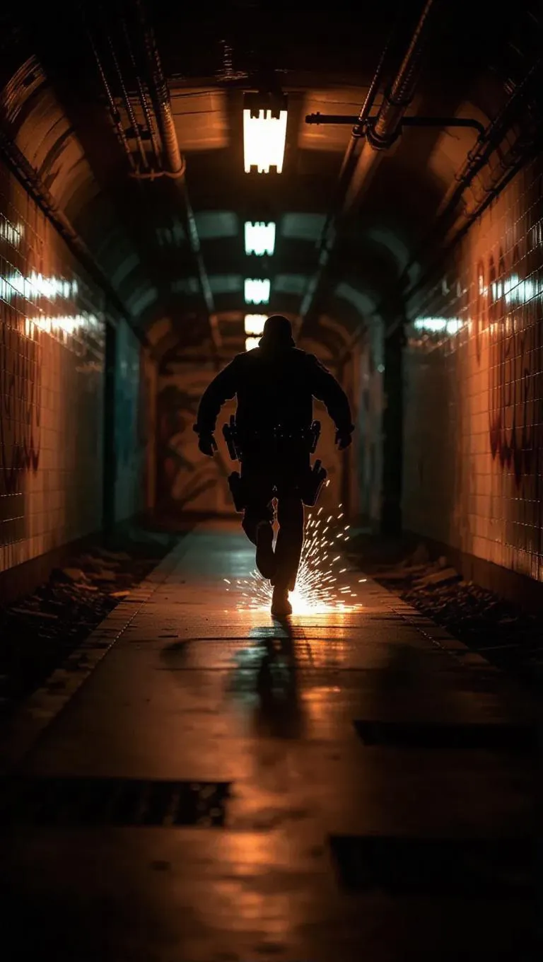 A tense foot chase through an abandoned subway station at midday, police boots pounding on concrete behind an exhausted runaway dodging debris. Sparks fly from flickering lights, revealing covered murals that fade into darkness. Normal camera angle, dramatic slow motion, muted color palette.
