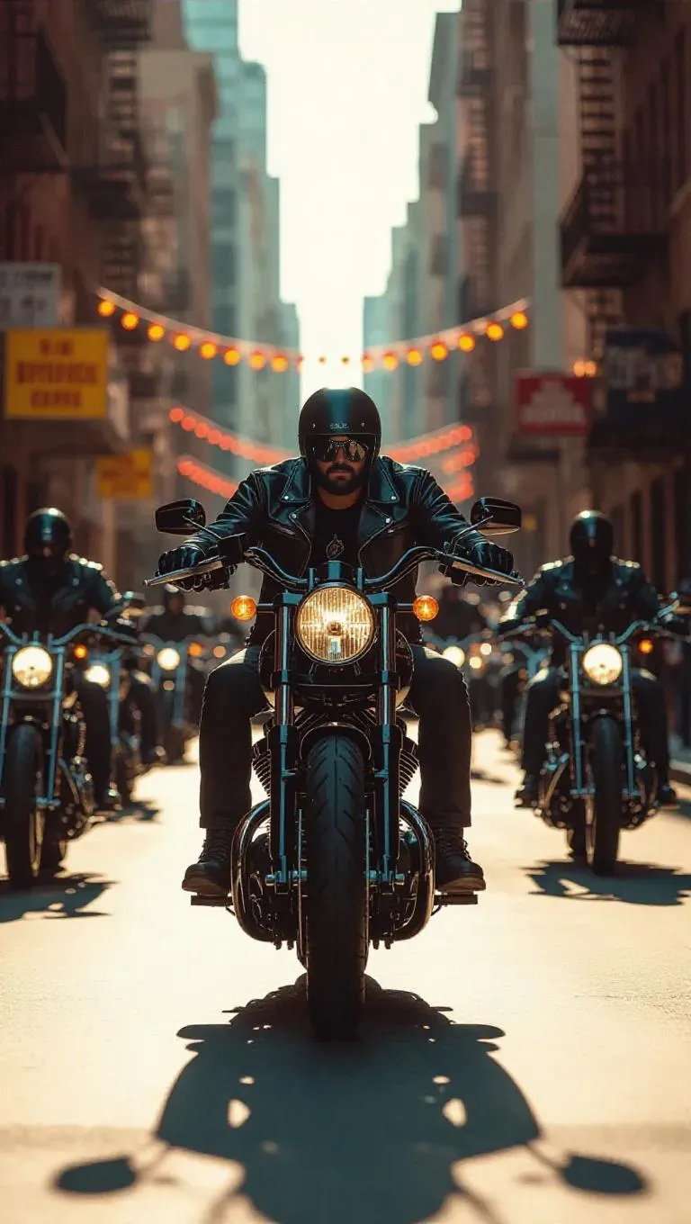 A biker gang revs their engines in a vibrant cityscape, leather jackets flapping in the warm breeze. Up ahead, a rival gang waits in the alley, weapons glinting in the sunlight. Tension fills the air, captured with strong vertical lines and a bright, saturated color palette.
