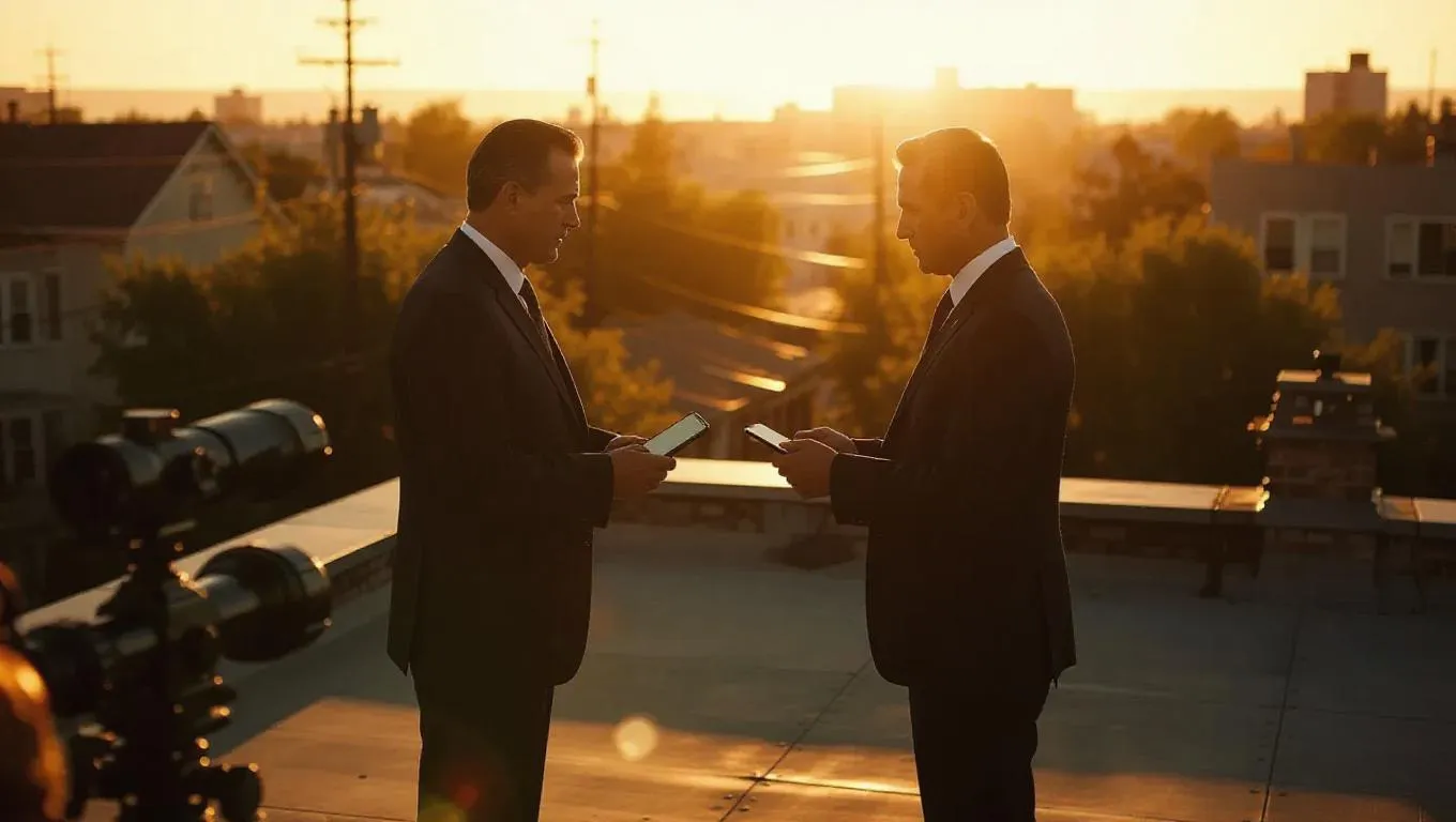 A clandestine meeting unfolds on a suburban rooftop bathed in golden hour light, where suit-clad negotiators flanked by armored guards exchange cell phones. Below, the city breathes in serene rhythms, and a sniper scope glints in the dark. Long-lens compression with cinematic bokeh, stylized atmospheric haze.