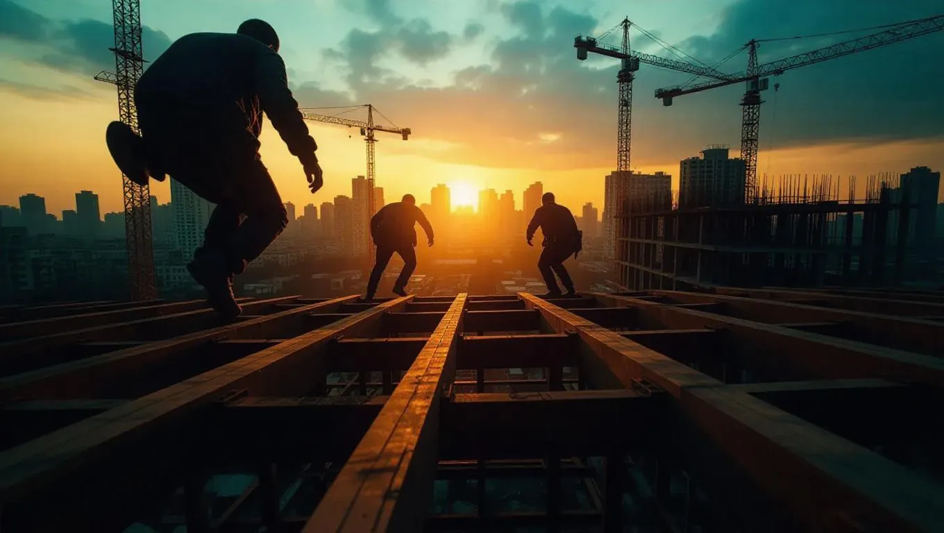 A thief scurries up the beams of a construction area while being pursued by detectives. The skyline of the city glows ominously, with cranes and incomplete buildings increasing the sense of urgency. The moment is encapsulated with intense angles and an edgy, urban feel.