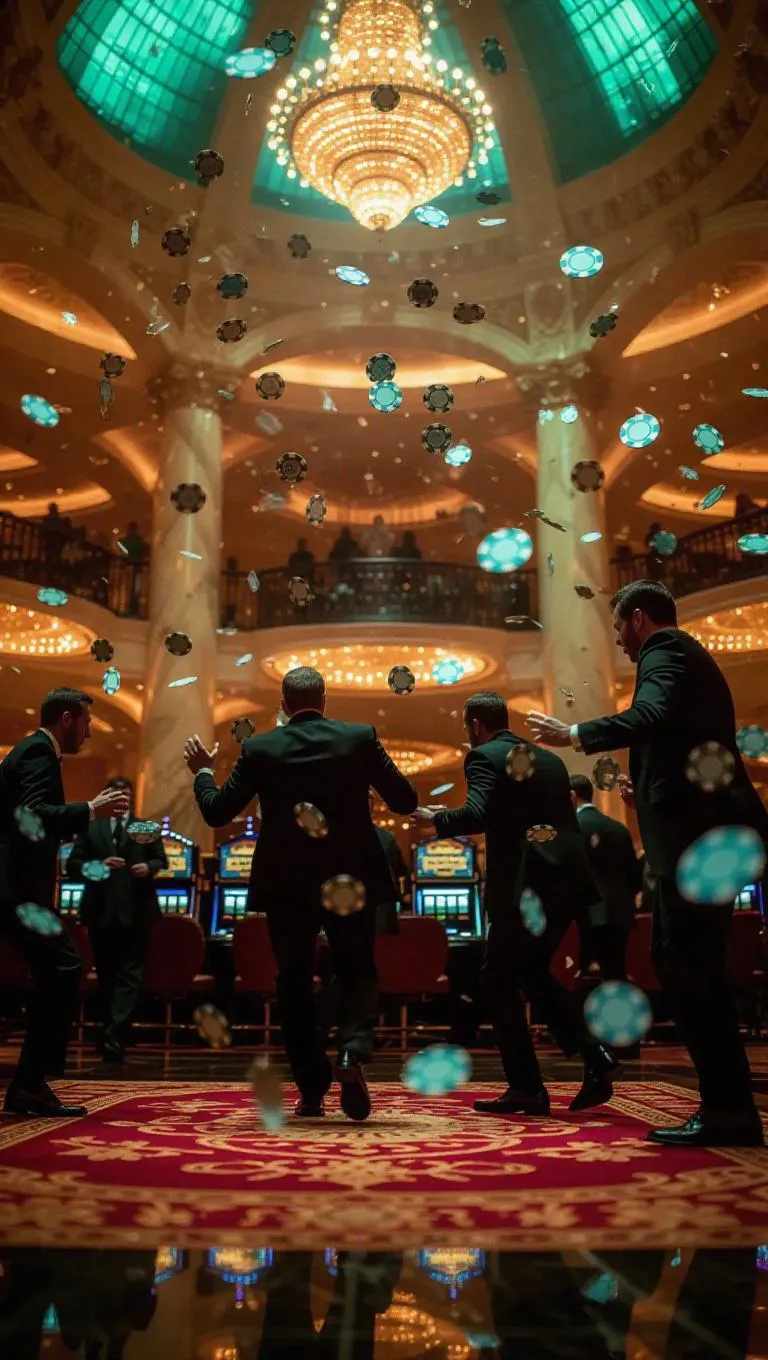 A dramatic casino heist in progress, quick-footed thieves weaving through security in a grand atrium, glittering chips and money caught midair in slow motion. Giant bold sculptures and embroidered carpets contrast the chaos. Dynamic swift camera tilt, freeze-frame intensity with light green lighting.