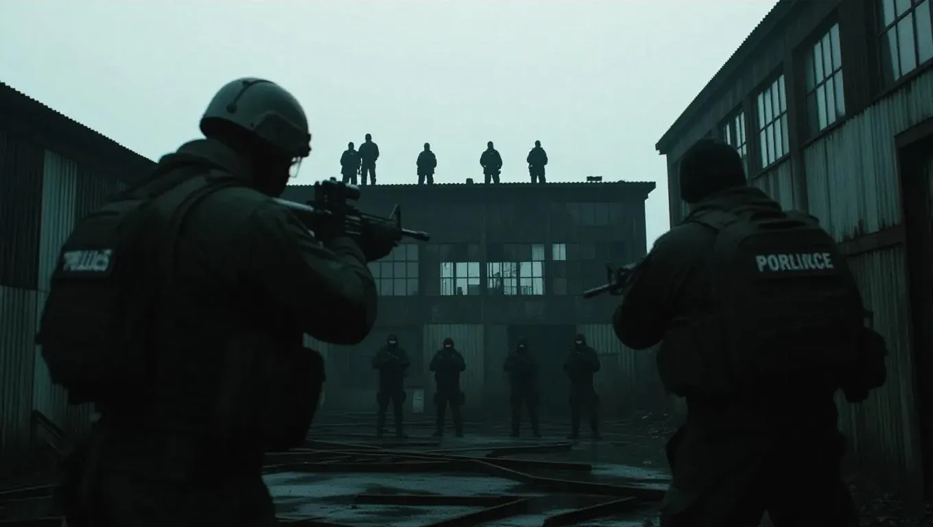 A gang takes hostages in an abandoned warehouse, with police snipers on the dilapidated roof. The scene is framed with a dark, gritty tone, enhancing the tension and isolation.