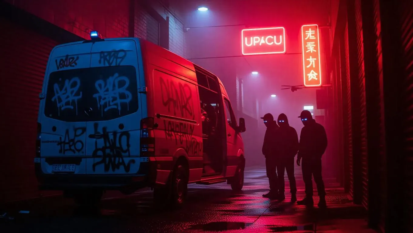 In a dimly lit alleyway, a crew of masked thieves huddle around a stolen armored van decorated with graffiti, its engine still warm. Neon signs flicker above, casting a mix of red and yellow hues over their worried faces. A police chopper circles in the distance, its spotlight piercing the fog. Jagged edges and a dark palette emphasize the gritty urban setting.