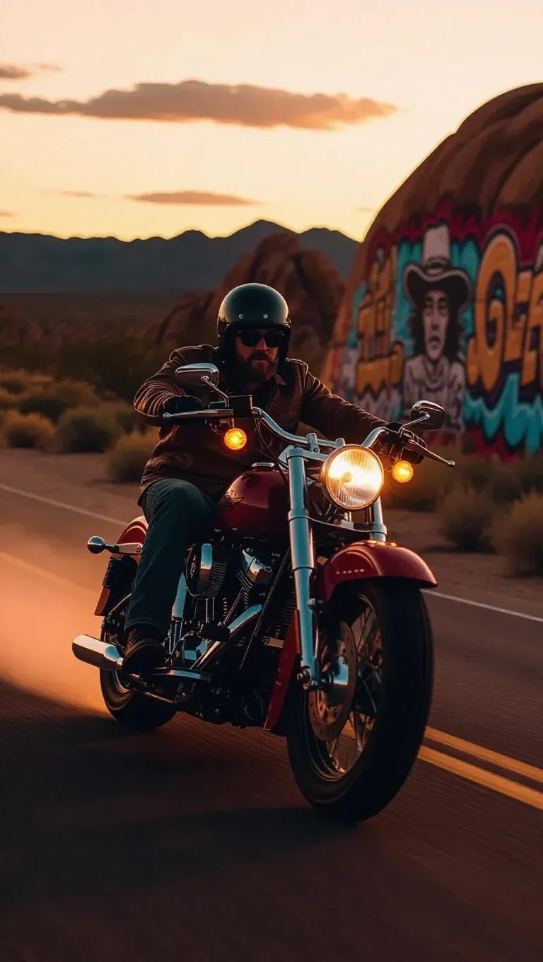 A vintage motorcycle roars down a flat desert road during the twilight hour, with outlaws leaning on the bike revving the engines. Graffiti art of historical figures decorates the nearby rocks, while rock music and distant explosions blend in the air. Warm tones with vibrant color grading and lens flares.