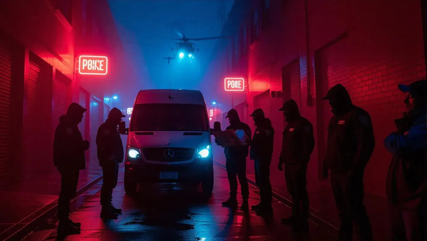 In a dimly lit alleyway, a crew of masked thieves huddle around a stolen armored van, looking at a map, its engine still warm. Neon signs flicker above, casting a mix of red and blue hues over their focused faces. A police chopper circles in the distance, its spotlight piercing the fog. Strong vertical lines and a deep contrast palette emphasize the gritty urban setting.