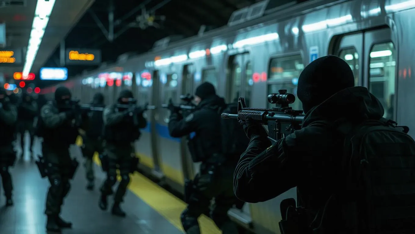 A gang takes hostages in a bustling train station, with police snipers positioned on a distant platform. The scene is framed with a dynamic, kinetic tone, emphasizing the tension and isolation.