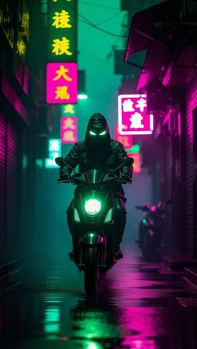 A neon-lit alley pulses with glitchy greens and violets as a rebellious thief hotwires an electric scooter, his face defiant and bold, fingers swiping across bright displays. Light mist fills the alley as ads flicker with vibrant animations about new technologies. Futurist noir composition with diverse textures and soft glowing highlights.