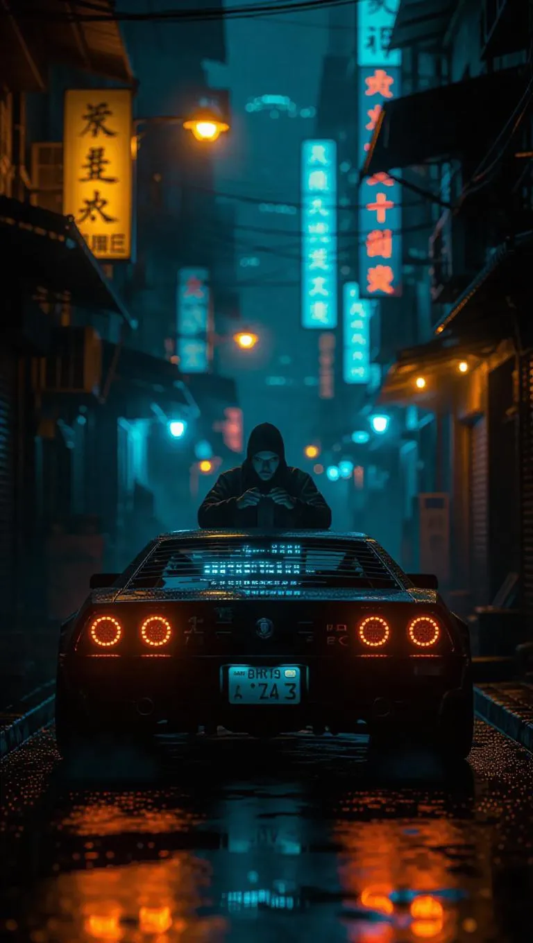 A neon-lit alley pulses with glitchy yellows and whites as a cunning thief hotwires a futuristic sedan, his face adventurous and illuminated, fingers type rapidly over glowing blueprints. The atmosphere thickens with mist as holographic projections flicker with lively messages. Futurist noir composition with intricate textures and dynamic backlight.