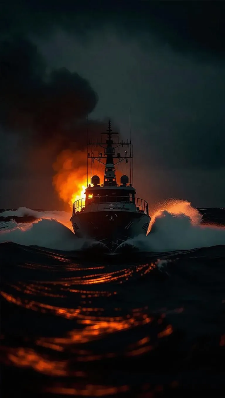 A getaway vessel dashes along a turbulent ocean, its crew escaping a naval patrol. The dramatic scene is enhanced by the fiery glow of emergency flares and the dark, stormy backdrop.
