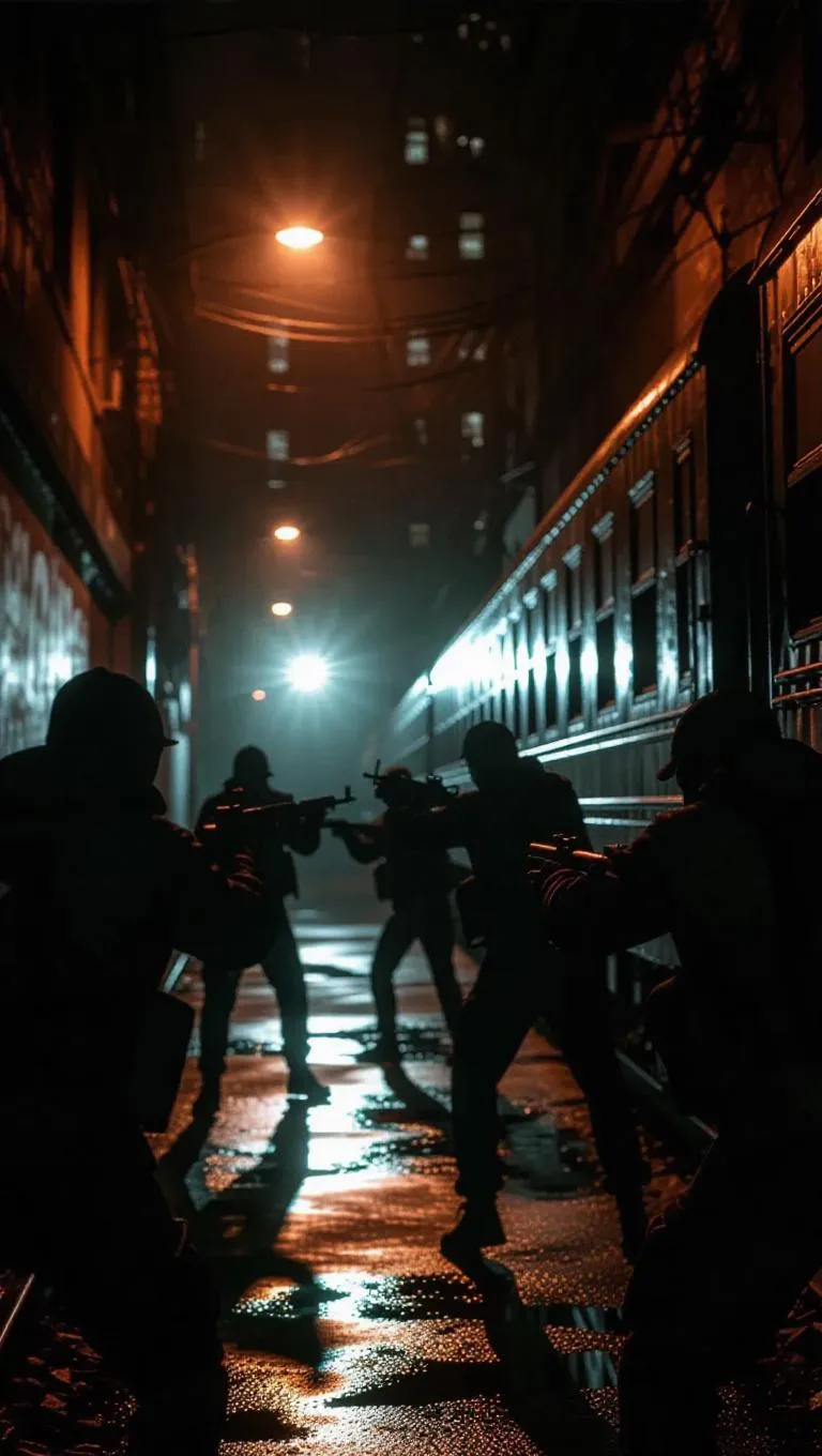 A gang ambushes a rival crew in a shadowy alleyway, their weapons glinting in the flickering light, echoes reverberating off the graffiti-covered walls. A train approaches in the distance, its headlights piercing the darkness, adding to the tension. The scene is captured with a gritty, urban aesthetic, emphasizing the raw energy and danger.