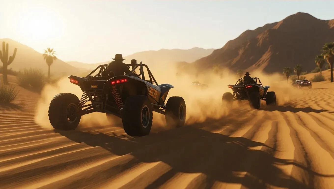 The desert outskirts of San Andreas, a dramatic backdrop for an epic showdown. CJ, riding a fast-paced dune buggy, engages in a intense shootout with a rival gang on ATVs. Dust clouds swirl around them, the setting sun casting long shadows and silver hues, enhancing the raw tension and visual spectacle.