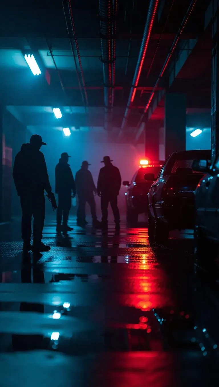 A gang confronts a rival crew in a dimly lit parking garage, their weapons glinting in the flickering light, echoes reverberating off the metal pillars. A police siren wails in the distance, its lights piercing the gloom, adding to the tension. The scene is captured with a gritty, urban aesthetic, emphasizing the raw energy and danger.