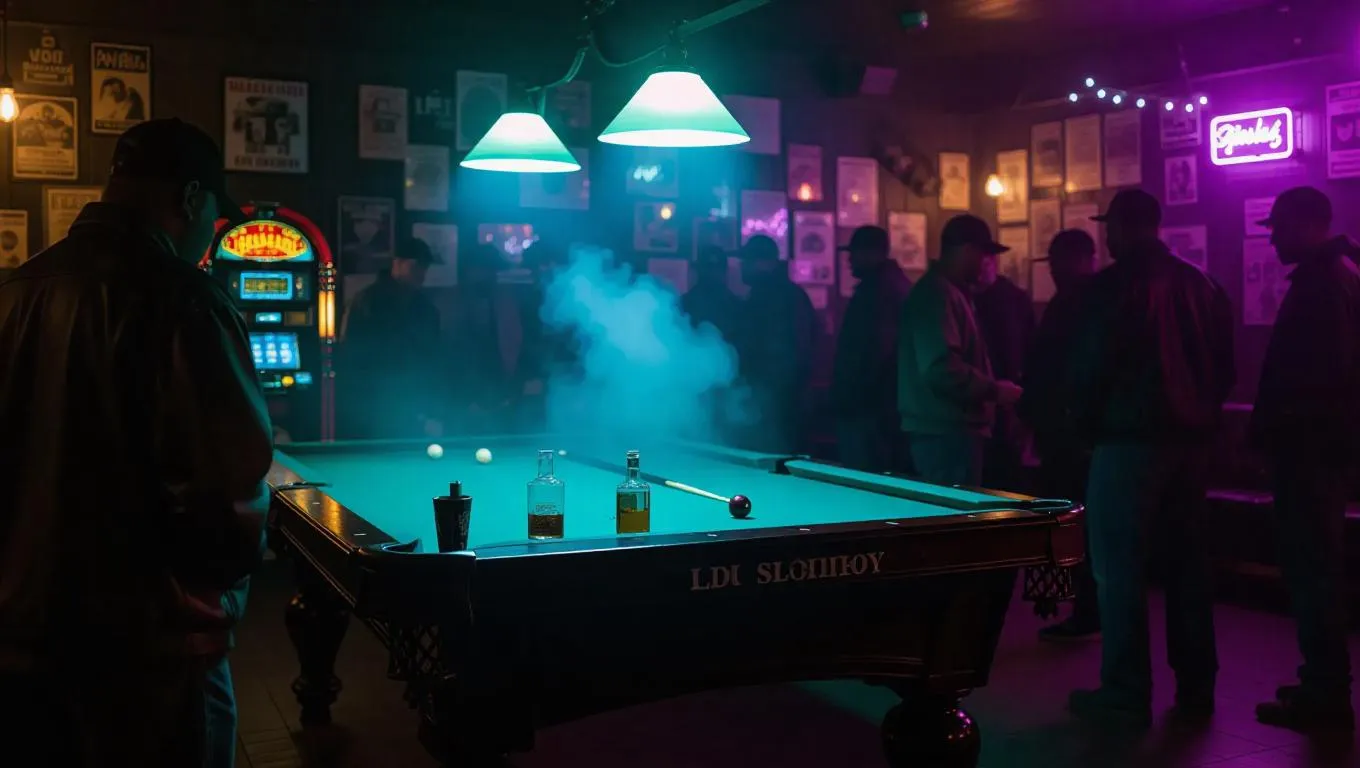 Inside a smoky pool hall, under flickering silver lamps, gang members crowd around an antique billiard table, weapons resting beside whiskey decanters. The walls sweat with age, paper flyers peeling back old feuds. A jukebox flickers in the corner, stuck between static and an alternative track. Isolated character lighting with strong foreground blur and polished texture.
