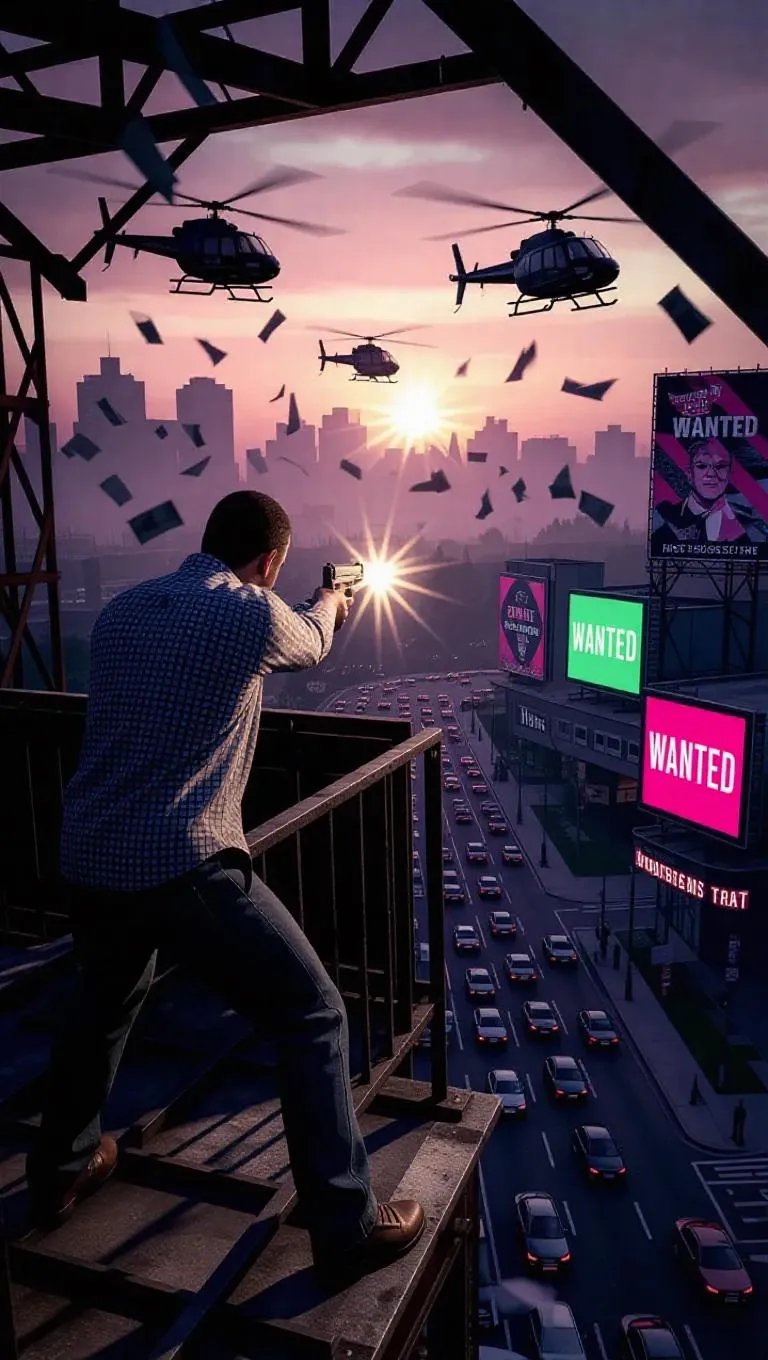 A rooftop standoff unfolds at twilight atop an abandoned warehouse, where a lone gangster in a checked shirt levels a pistol at encroaching SWAT units. Helicopter rotors churn the misty sky, sending paper debris and dust spiraling across the skyline. Below, traffic snarls in a sea of headlights, while digital billboards flash “WANTED” warnings in bright pinks and greens. Tension crackles in the haze, accentuated by sun flares slicing between rusted steel beams and artistic advertisements. Dynamic third-person composition, chiaroscuro contrasts with lively colors.
