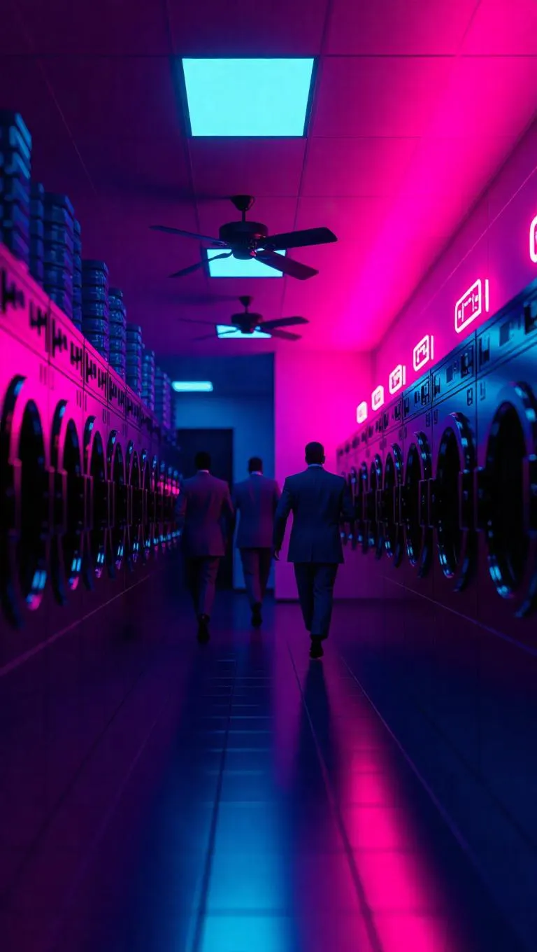 A drug lab hidden beneath a laundromat glows with ultraviolet light, shelves cluttered with substances, as figures in gray suits run to destroy evidence before a raid. Ceiling fans cast eerie rotating shadows across a glowing timer. Tense neon-dystopia interior with vibrant textures.