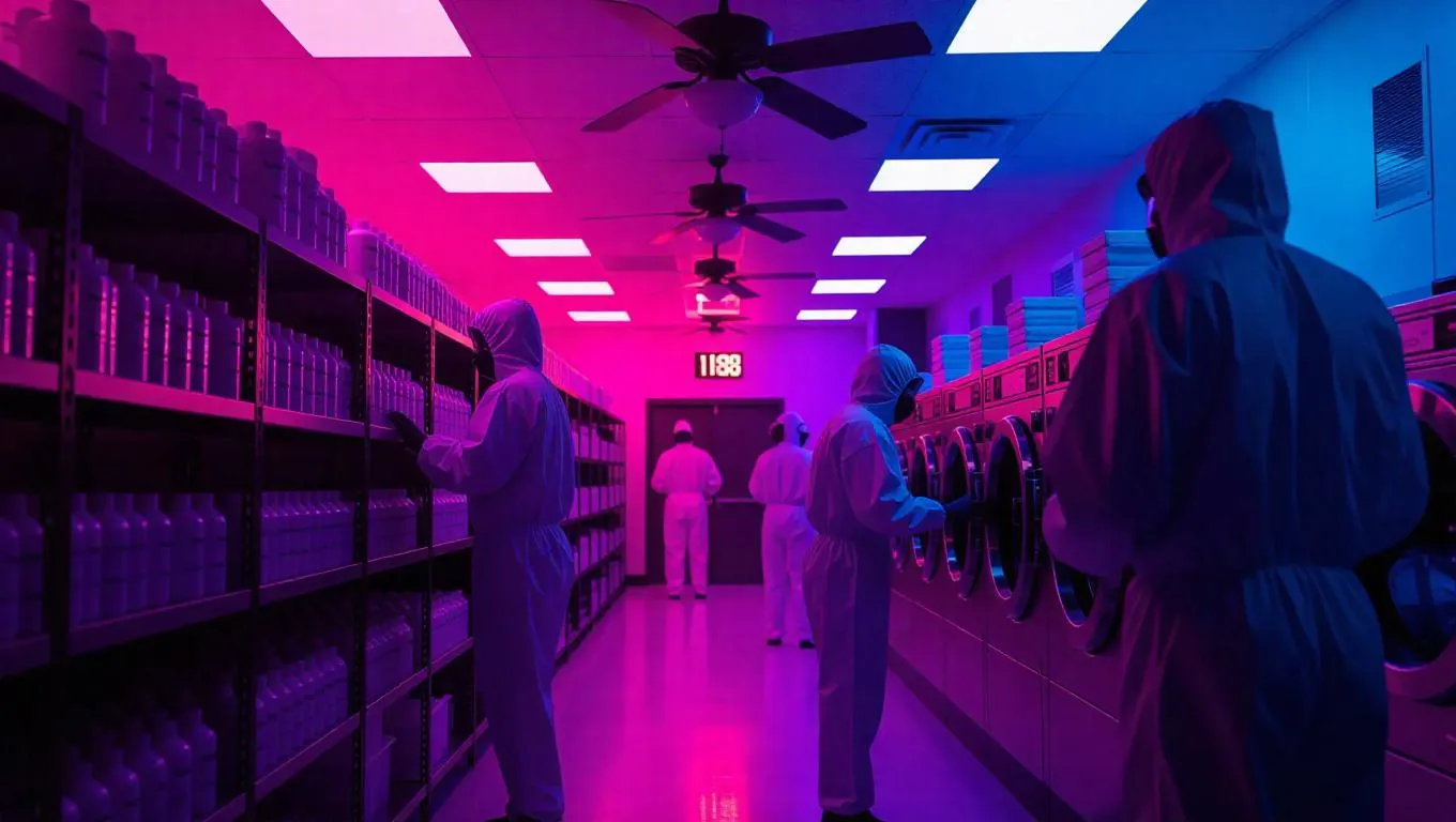 A drug lab hidden beneath a laundromat glows with ultraviolet light, shelves stacked with chemicals, as figures in hazmat suits race to destroy evidence before a raid. Ceiling fans cast eerie rotating shadows across a ticking countdown timer. Tense neon-dystopia interior with industrial texture.