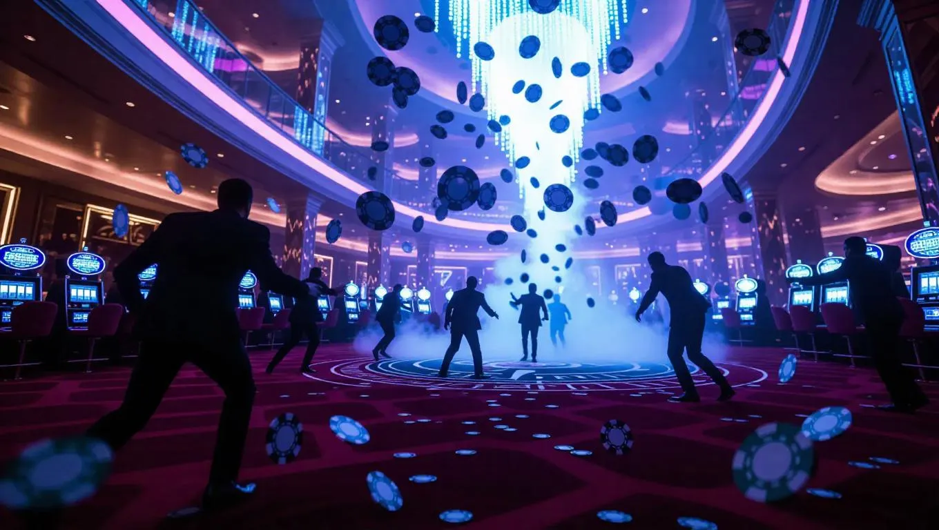 A dramatic casino heist in progress, stealthy figures throwing smoke bombs in a grand atrium, glittering chips and money caught midair in slow motion. Giant neon sculptures and shag carpets contrast the chaos. Dynamic close-up camera zoom, freeze-frame intensity with icy white lighting.