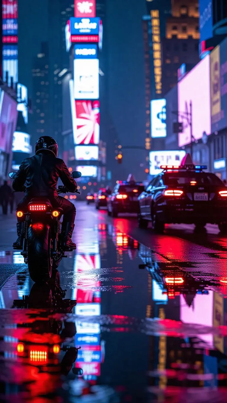 A lone motorcyclist in a black leather jacket speeds down a crowded boulevard, backlit by emergency lights and vibrant billboards. Digital reflections shimmer across puddles, and behind him, a chain of patrol cars twist through city shadows. Motion-capture angle from below, sparks trailing from the tailpipe, dramatic shallow depth of field.
