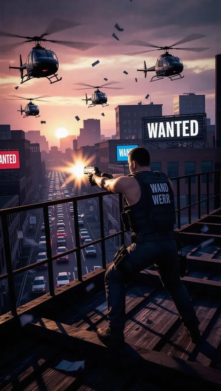 A rooftop standoff unfolds in twilight atop a rundown factory, where a lone gangster in a tactical vest levels a pistol at encroaching SWAT units. Helicopter rotors churn the smoky air, sending paper debris and dust spiraling across the skyline. Below, traffic snarls in a sea of headlights, while digital billboards flash “WANTED” warnings in stark black and white. Tension crackles in the haze, accentuated by sun flares slicing between rusted steel beams and flashing neon lights. Dynamic third-person composition, chiaroscuro contrasts with dramatic lighting.