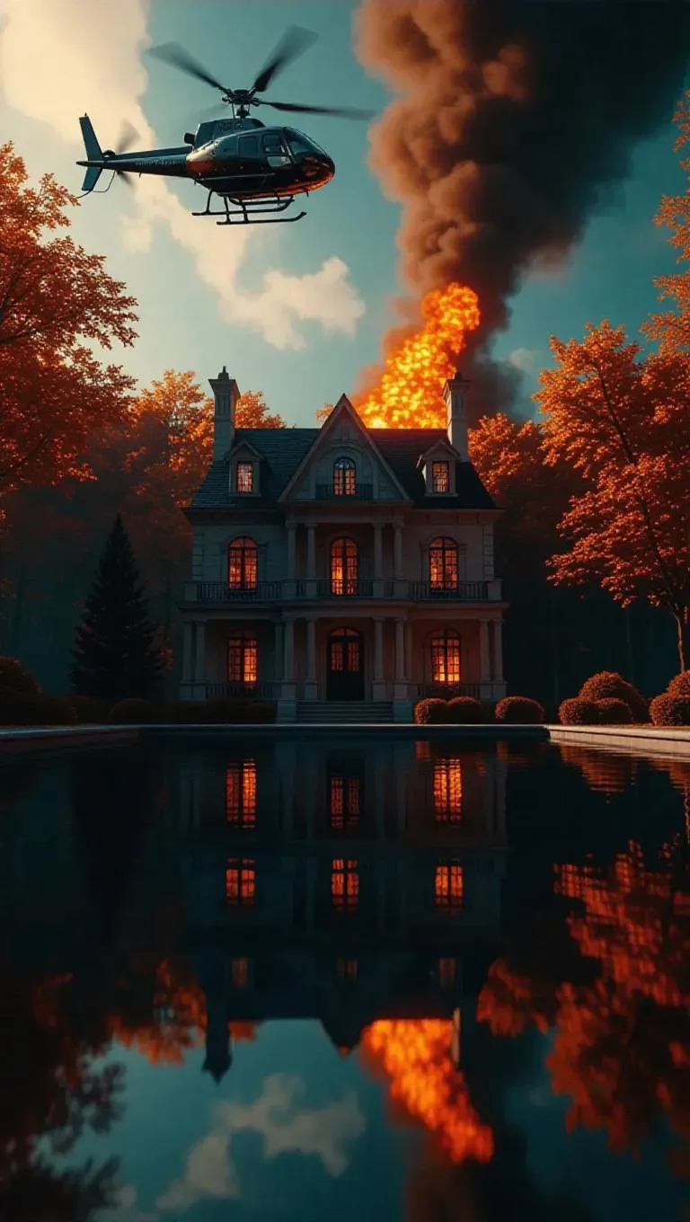 A booby-trapped mansion explodes in a forest, fireballs silhouetting maple trees, as a helicopter escapes into the clear sky. Infinity pool reflects both fire and the vibrant autumn leaves. Epic wide shot with deep layering and orange-teal blockbuster palette.