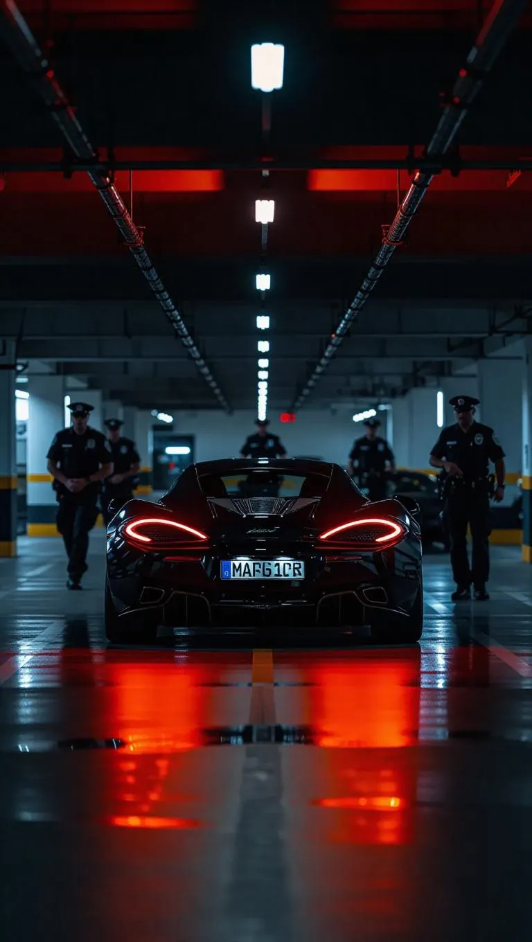 In a high-end parking garage, a trio of thieves stealthily cracks open a sleek sports car, its alarm blaring faintly. Security guards approach cautiously, flashlights scanning the dimly lit area. Warm overhead lights cast shadows, emphasizing the stark contrast between luxury and crime.