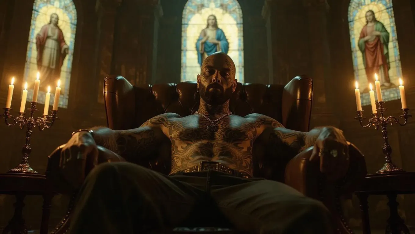 A heavily-tattooed gangster lounges in a plush armchair inside an art deco-style church turned hideout, gold candles flickering beside assault rifles and gold chalices. A stained-glass saint glows behind him, casting fractured color across his face. Baroque lighting meets street crime with chiaroscuro styling.
