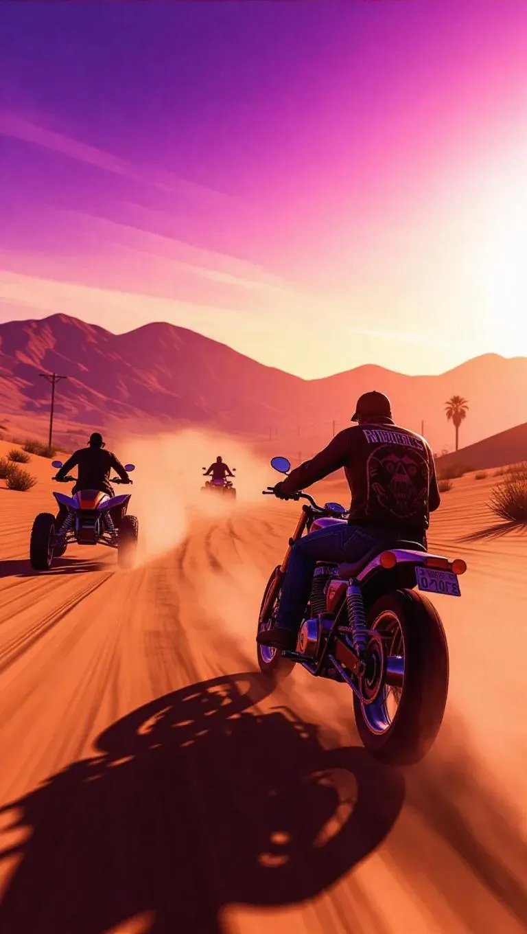 The desert outskirts of San Andreas, a dramatic backdrop for an epic showdown. CJ, riding a vintage motorcycle, engages in a intense shootout with a rival gang on ATVs. Dust clouds swirl around them, the setting sun casting long shadows and purple hues, enhancing the raw tension and visual spectacle.