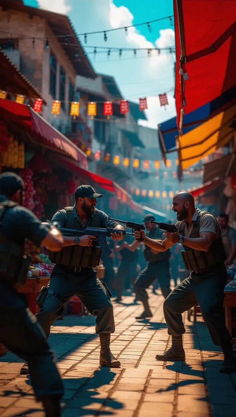 Two rival gangs confront each other in a bustling marketplace, weapons clashing and echoing off the stalls. Colorful goods and shouting vendors enhance the chaotic atmosphere. The scene is captured with a lively, saturated palette, emphasizing tension and danger.