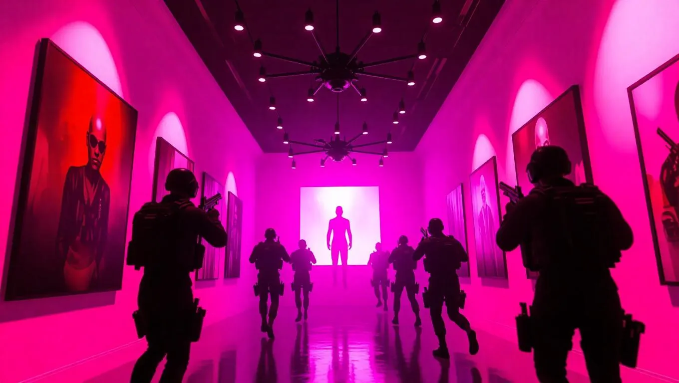 Inside a trendy art gallery in Liberty City, a high-stakes heist unfolds. Thieves, clad in futuristic outfits, descend from the ceiling using drones, stealthily stealing priceless art installations. Alarms blare, casting a chaotic fuchsia glow, as security guards sprint through the halls, guns raised, to intercept the criminals.