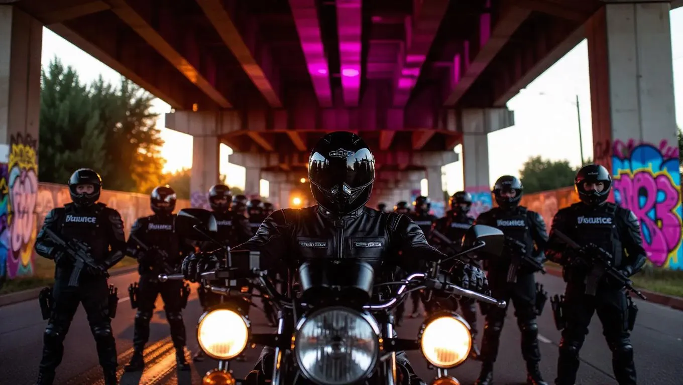An armored biker collective blocks a stranded armored car under a dilapidated overpass, glaring floodlights emphasizing their presence, vibrant murals behind them reflecting a call to freedom.